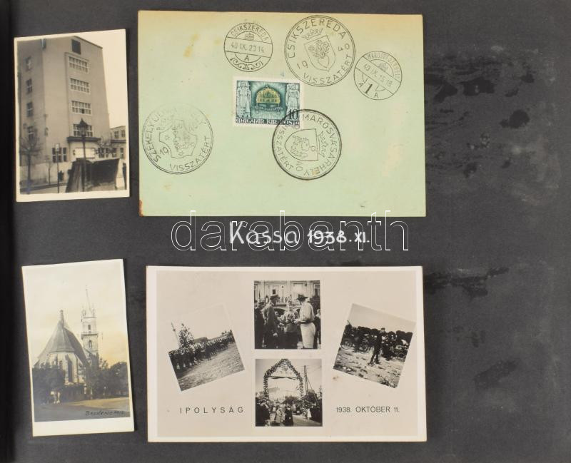 A M. kir. 19. gyalog dandár 1938, 1939, 1940,1941, Felvidék, Kárpátalja, Erdély, Délvidék bevonulások fényképgyűjtemény albumban. 440 db nagyrészt egyedi fotó feliratozott lapokon a legkülönfélébb helyiségekből, nagyon érdekes képekkel. Horthy Erdélyben, utcai harcok Zentán, a románok áldozata, lelőtt repülők, visszavonuló csehek, stb.