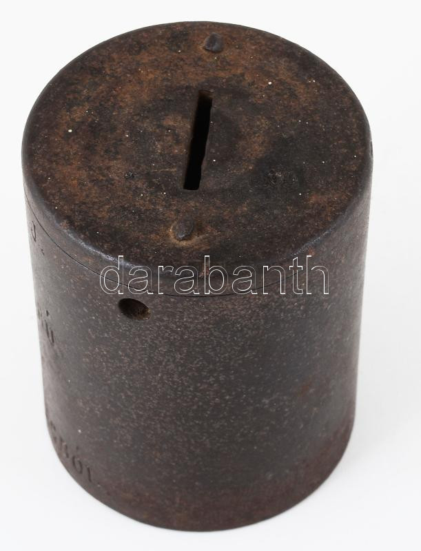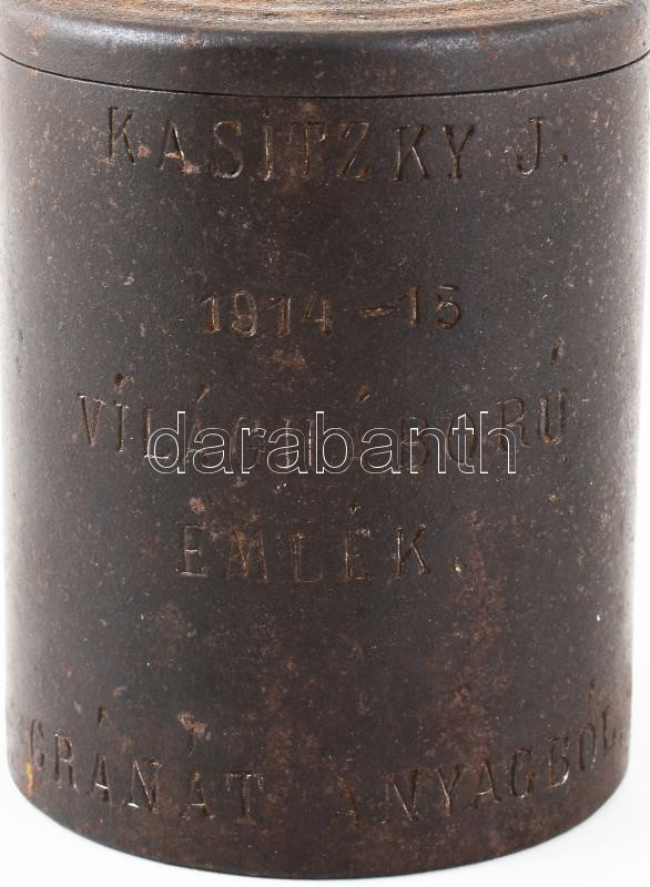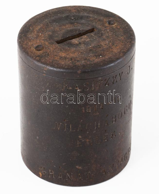 I. világháborús emlék persely, masszív fém, "Kasitzky J. 1914-15 világháború emlék gránát anyagból" felirattal, lecsavarható fedéllel, pénzbedobó nyílással, m: 9 cm, d: 7 cm