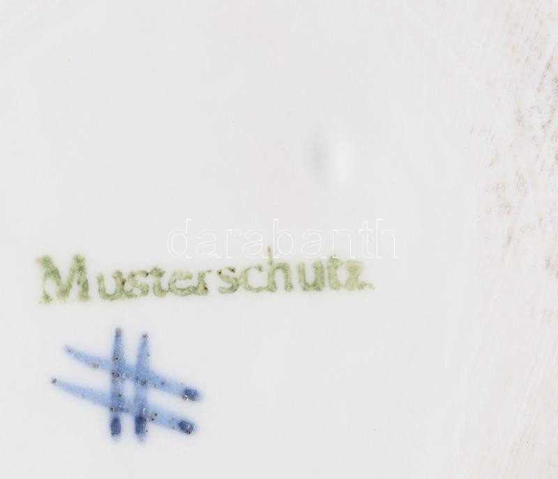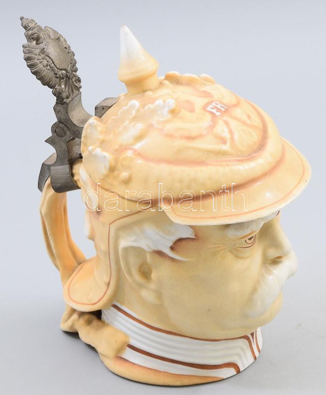 Otto von Bismarck kancellárt mintázó német porcelán sörös korsó, fém szerelékkel, alján "Musterschutz" jelzéssel, cca. XX. sz. eleje, korát tekintve jó állapotban, m: 17,5 cm // Otto von Bismarck German porcelain beer mug, marked "Musterschutz" on the bottom, ca. early 20th century, in good condition