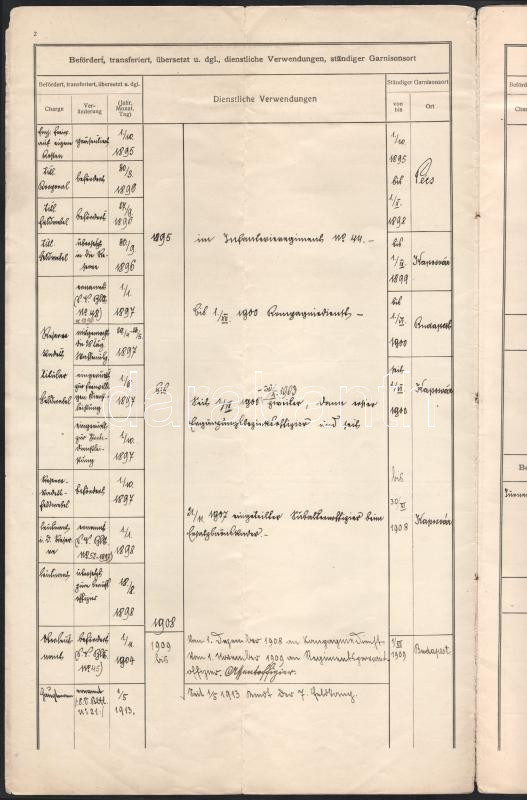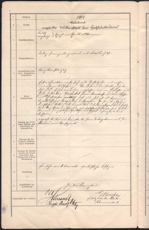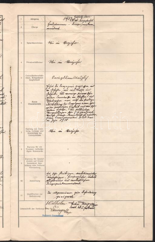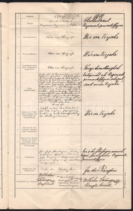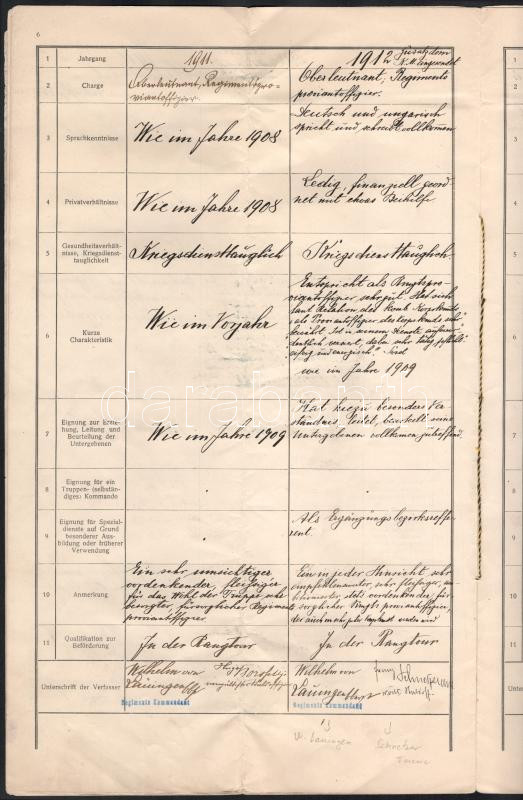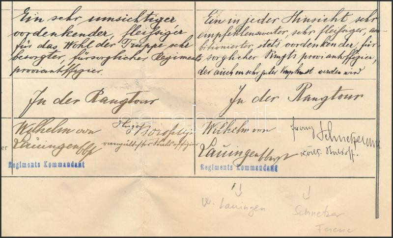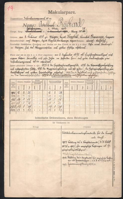 Reichardspergi Reichard Béla (Adalbert Reichard) (1876-1921), a cs. és kir. 44. gyalogezred századosa (később őrnagy, majd m. kir. ezredes) 1913-ig terjedő katonai szolgálatáról kiállított, részletes német nyelvű jelentés (Makularpare); az összesen 10 számozott oldallal rendelkező dokumentumban 6 beírt oldalon a személyes adatok, a teljesített szolgálati idő, kitüntetések, rendfokozatok és előléptetések, illetve egyéb tudnivalók leírásával. Több oldal alján parancsnoki aláírásokkal, köztük Lauingen Vilmos (Wilhelm von Lauingen) ezredparancsnok, illetve Schnetzer Ferenc (1867-1944) alezredes (1915-től ezredesként a cs. és kir. 68. Jászkun gyalogezred parancsnoka, később vezérőrnagy; a Tanácsköztársaság idején a Fehérház Bajtársi Egyesület nevű ellenforradalmi csoport tagja; a Friedrich-kormányban 1919. augusztus 15. és november 24. között honvédelmi miniszter) autográf aláírásával. Fűzve, helyenként kisebb sérülésekkel, 41x24,5 cm.