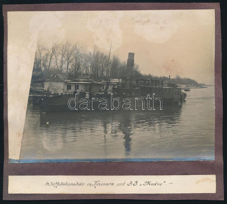 S.M.D. Medve a Dunai Flottila szállító hajójának fényképe Kevevárán / Hátoldalán német katonák hajót javítanak 1915