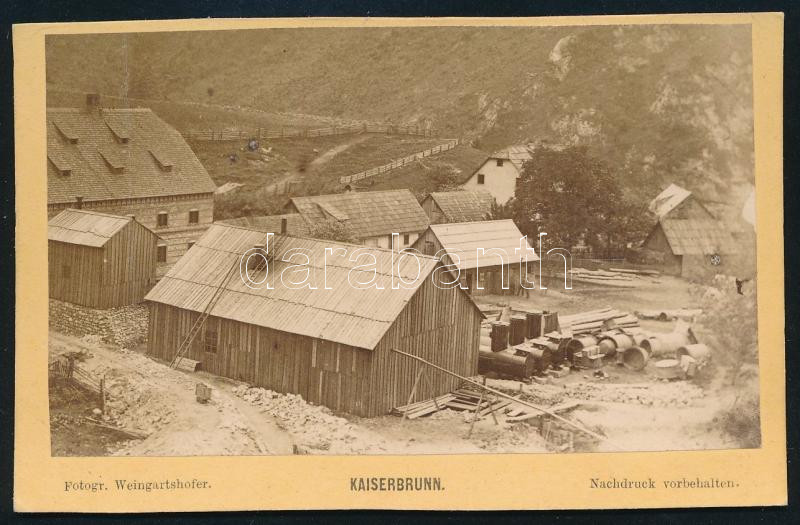 cca 1875 Az alsó-ausztriai Kaiserbrunn egy részlete vízszállító hordókkal, később a bécsi vízvezeték-hálózat kiindulópontja, a schneebergi forrásvízzel, keményhátú fotó Weingartshofer műterméből, felirattal, szép állapotban, 6,5×10,5 cm