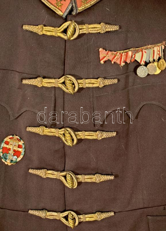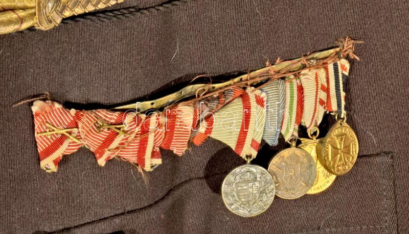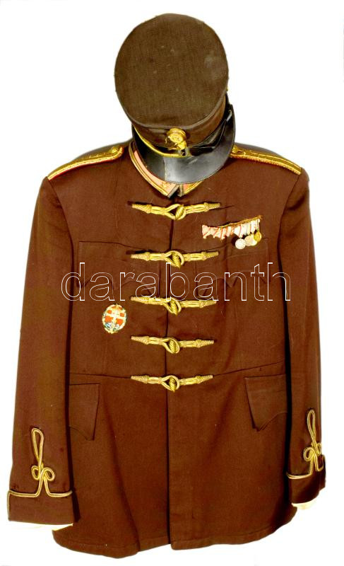 cca 1918. Tűzér főhadnagyi atilla és sapka, valamint díszelgő kard, kardbojtokkal. A zubbonyon szalagsávval, és kitüntetések miniatűrjeivel ( Magyar Háborús Emlékérem kardokkal, sisakkal; Bolgár Európai Háborús Emlékérem; Osztrák Háborús Emlékérem; Német Háborús Emlékérem valamint 3 darab Vitézségi érem szalag, ebből kettő kardokkal, Károly Csapatkereszt szalagja, Sebesültek érme szalagja, Erdélyi emlékérem szalagja ), valamint csapattiszti zománc jelvénnyel. Jó állapotban.