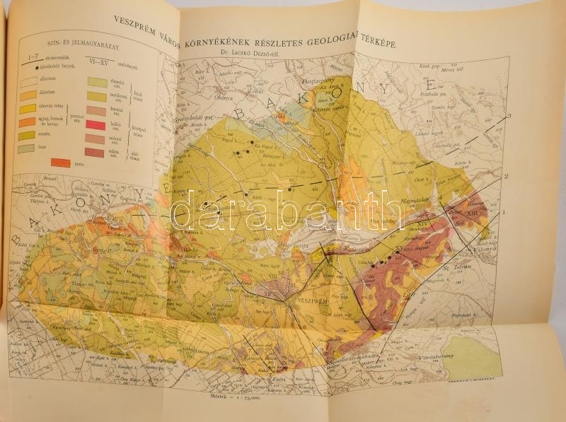 Bp., 1911, Kilián Frigyes, (Hornyánszky-ny.), 6+189+5 p.+ 1 (kétlapos) t. + 2 (színes, kihajtható geológiai térképek: Veszprém város környékének részletes geologiai térképe, Veszprém város részletes geologiai térképe ) t.;+4+169+1 p.+2 (a táblák előtt magyarázó lapokkal) t.+2;+2+13+3+;+2+16+2+17-18;+2+2;+2+18 p.+XI (táblázatok) t.;+16+2+17+3 p. Fekete-fehér szövegközti képanyaggal illusztrált. Bekötött papírborítóval. Átkötött modern egészvászon-kötés, névbejegyzéssel, jó állapotban.