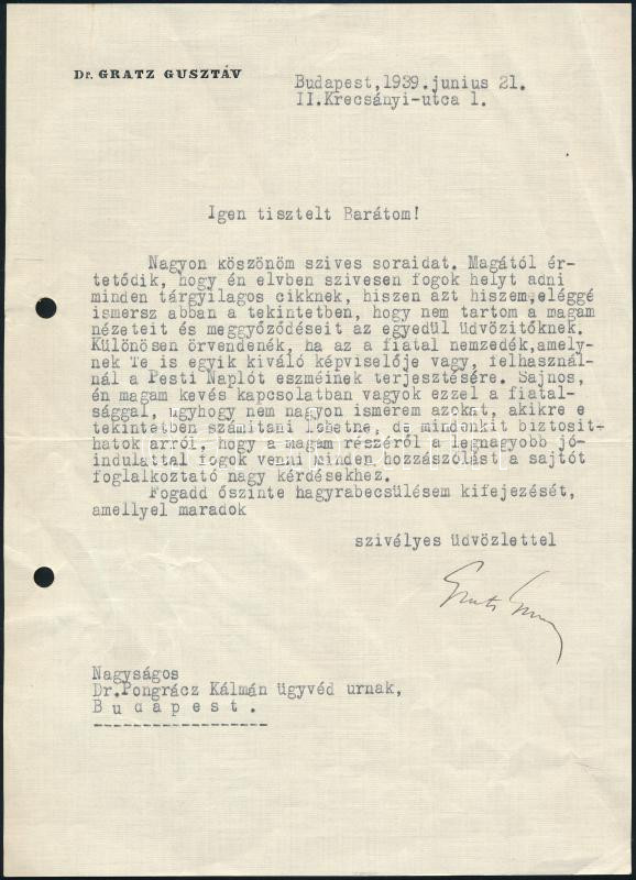 1939 Bp., Gratz Gusztáv külügyminiszter, író által aláírt levél https://www.darabanth.com/de/45-Gross-Auktion/45.1/Kunst-Dokumente-andere-Sammelgebiete/Signatur~18551/1939-Bp-Gratz-Gusztav-kulugyminiszter-iro-altal-alairt-level~II3447526