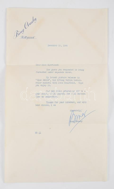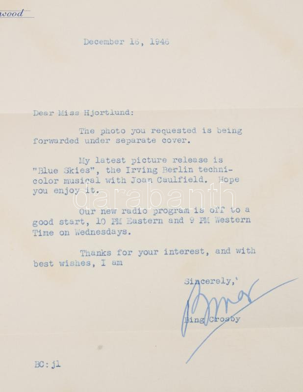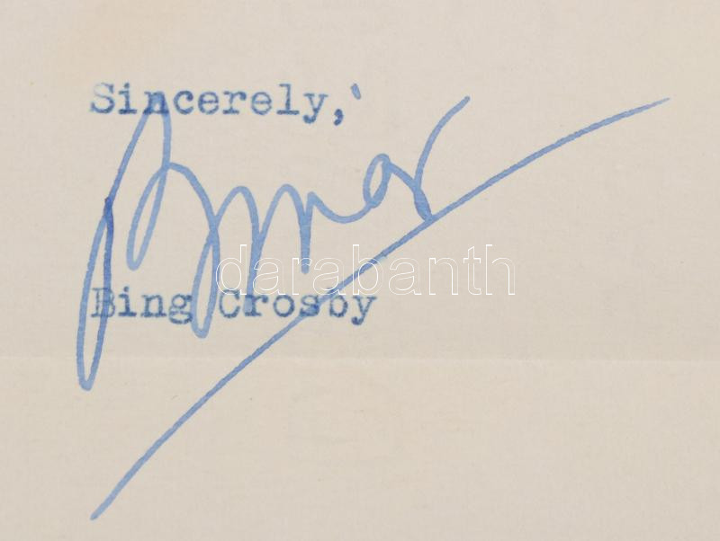 1946 Bing Crosby (1903-1977) amerikai színész, énekes saját kézzel aláírt fejléces levele, melyet fotója mellé mellékelt /
