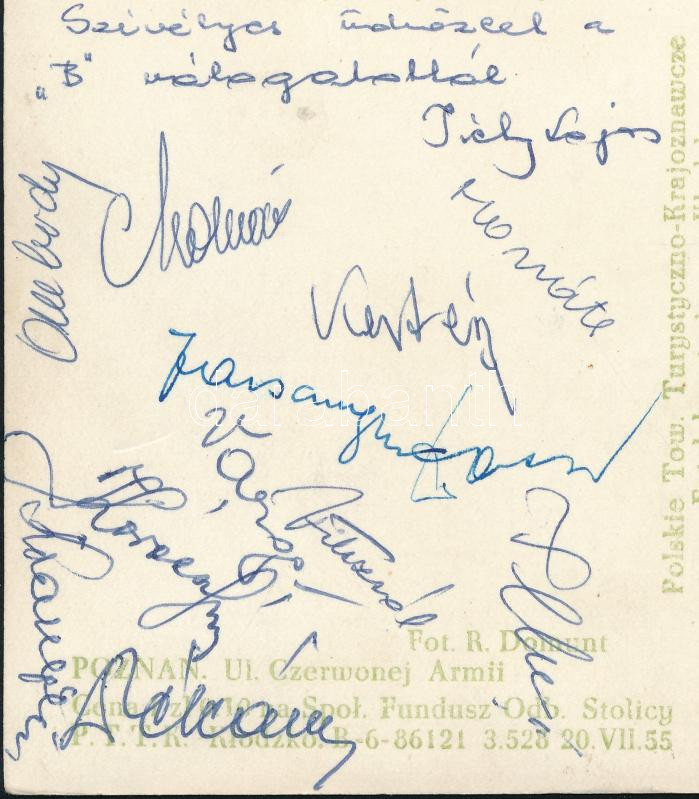 1956 Poznan, a magyar B válogatott labdarúgóinak aláírásai hazaküldött képeslapon: Ombódi Imre, Dékány Ferenc, Farsang Ferenc, Ilku, Kertész, Tichy Lajos, Vilezsál Oszkár és mások (összesen 12 db aláírás)
