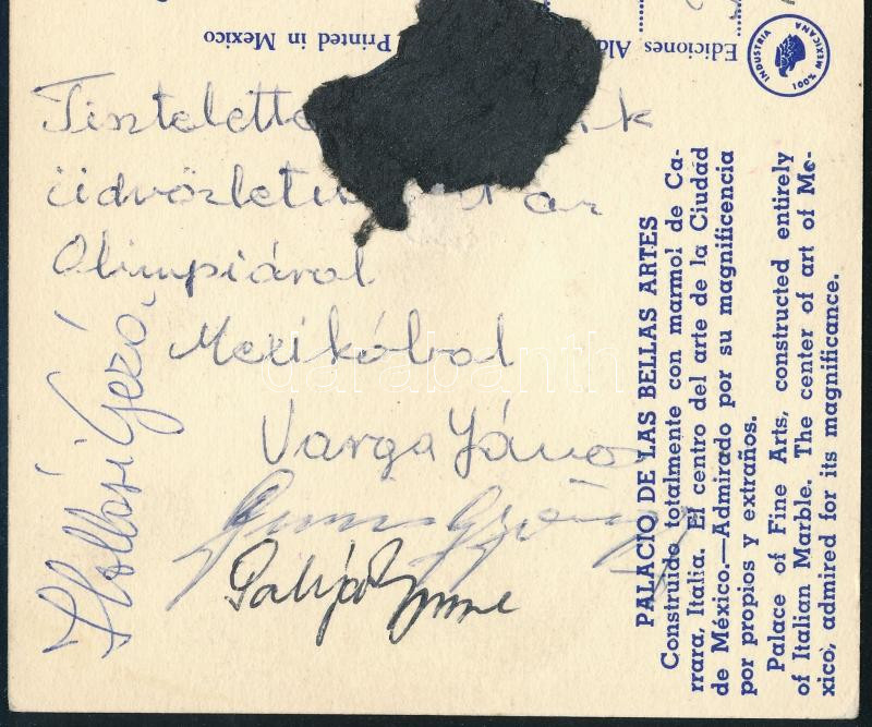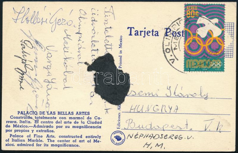 1968 Polyák Imre (1932-2010) és Varga János (1939-2022) olimpiai bajnok birkózók, illetve Gurics György (1929-2013) és Hollósi Géza (1938-2002) birkózók autográf aláírása a mexikói olimpiáról hazaküldött képeslapon