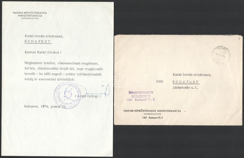 Beschreibung: 1975 Bp., Aczél György politikus, miniszterelnök-helyettes által aláírt levél és borítékja