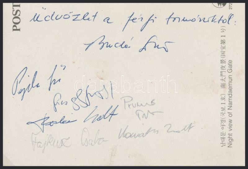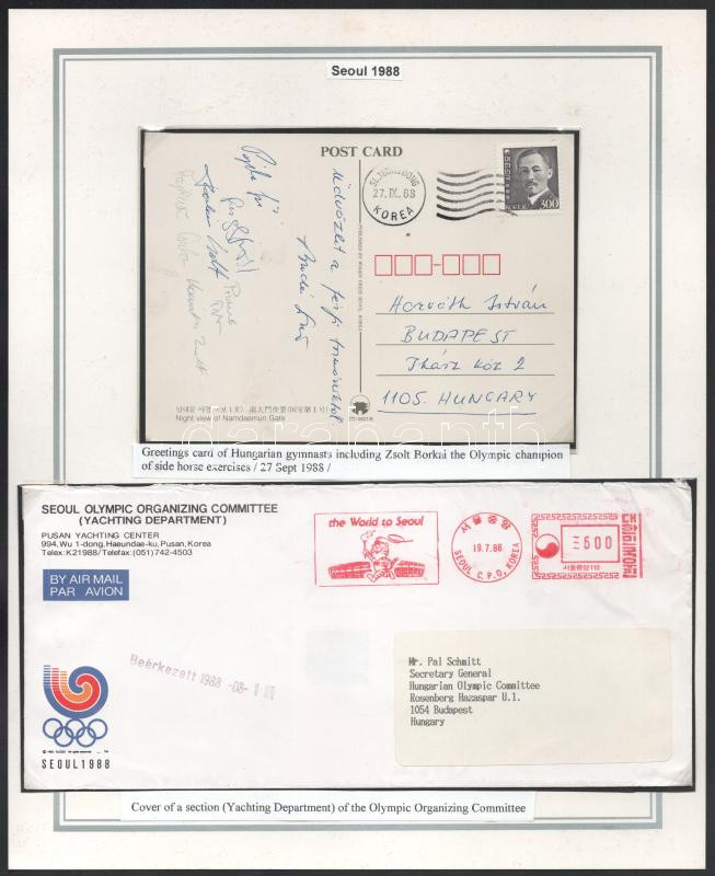 Beschreibung: 1988 Szöul magyar olimpikonok, Borkai Zsolt, Kováts Zsolt, Fajkusz Csaba, stb aláírásai az olimpiáról hazaküldött levélen.