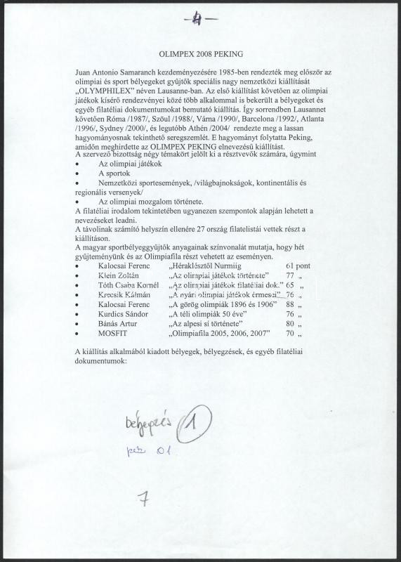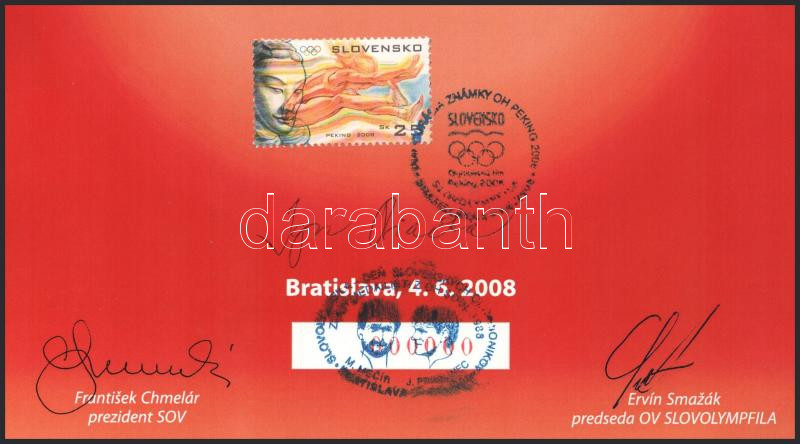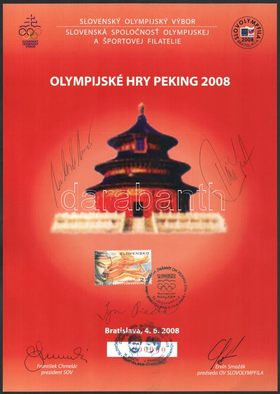 2008 Szlovák olimpikonok és sportvezetők által aláírt emléklap Pekingi Olimpia.