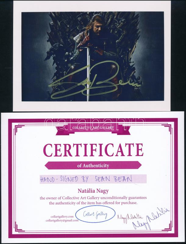 Sean Bean brit színész aláírása, aki karizmatikus alakításaival vált világszerte ismertté. Legikonikusabb szerepei közé tartozik Boromir karaktere A Gyűrűk Ura: A gyűrű szövetsége (2001) című filmben, valamint Eddard Stark a Trónok harca (2011) sorozatban.