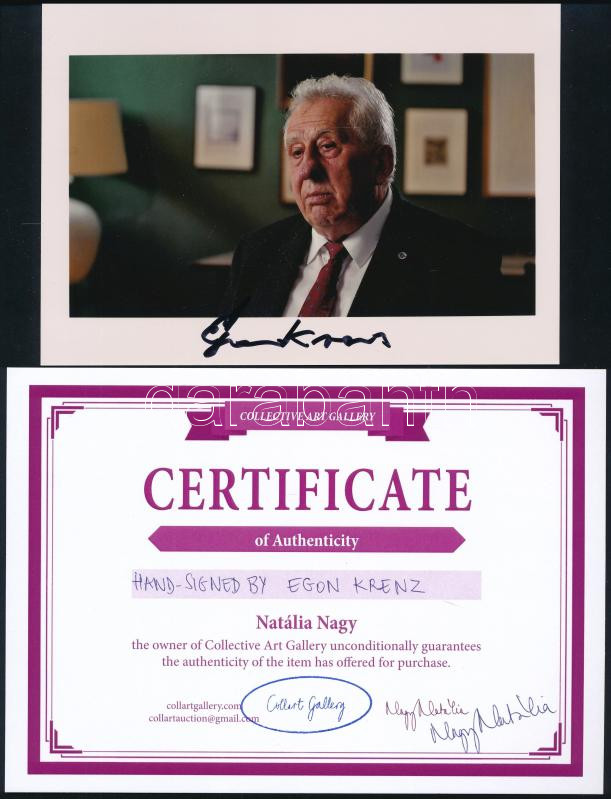 Egon Krenz neve összeforrt a keletnémet történelem utolsó fejezetével. 1989-ben, a politikai átalakulások közepette ő vette át az NDK irányítását, és ezzel a berlini fal leomlásának idején az ország első számú vezetője lett. Az aláírt fényképe nem csupán egy relikvia ? ez egy korszak lenyomata, amely a hidegháború utolsó pillanatait idézi.