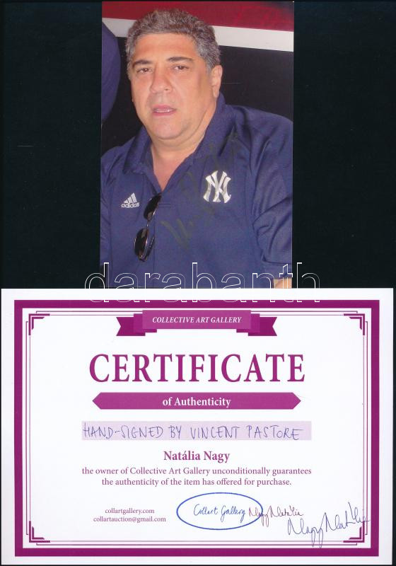 Vincent Pastore amerikai színész, aki a Maffiózók (The Sopranos) című sorozatban Salvatore "Big Pussy" Bonpensiero szerepében vált ismertté. Karaktere a maffia belső világának egyik legtragikusabb figurája, akinek sorsa a sorozat egyik legmegrázóbb fordulata. Az aláírt fényképe nem csupán egy televíziós relikvia, hanem egy darabja annak a korszaknak, amikor a sorozatok újraértelmezték a dráma fogalmát.