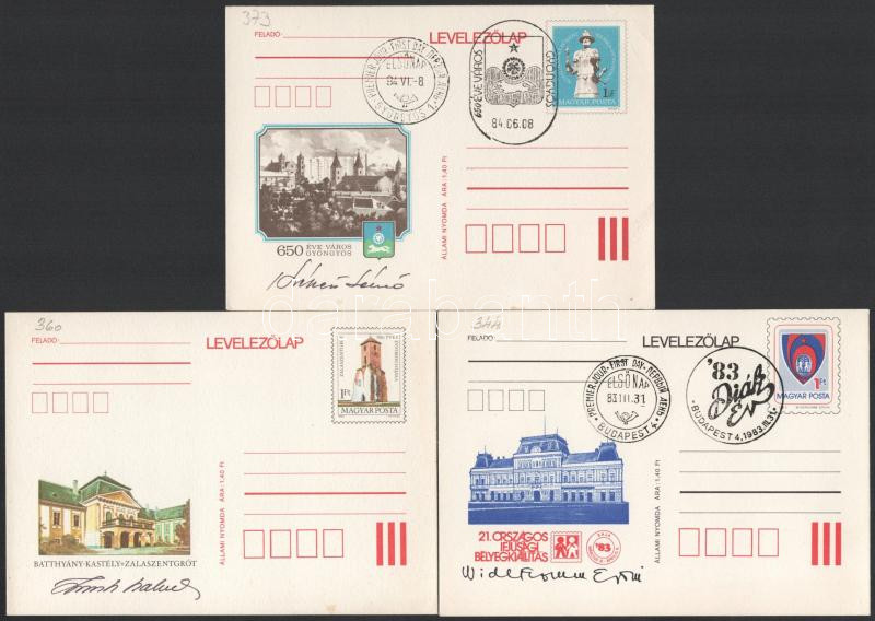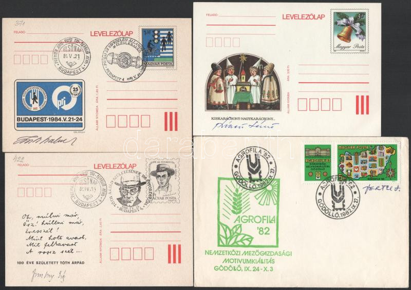 7 db levelezőlap bélyegekkel, rajta a bélyegtervezők autográf aláírásaival. Zsitva Szabolcs, Kékesi László, Zombory Éva, Vertel József, Kékesi László, Zsitva Szabolcs, Wiederkomm Ervin.