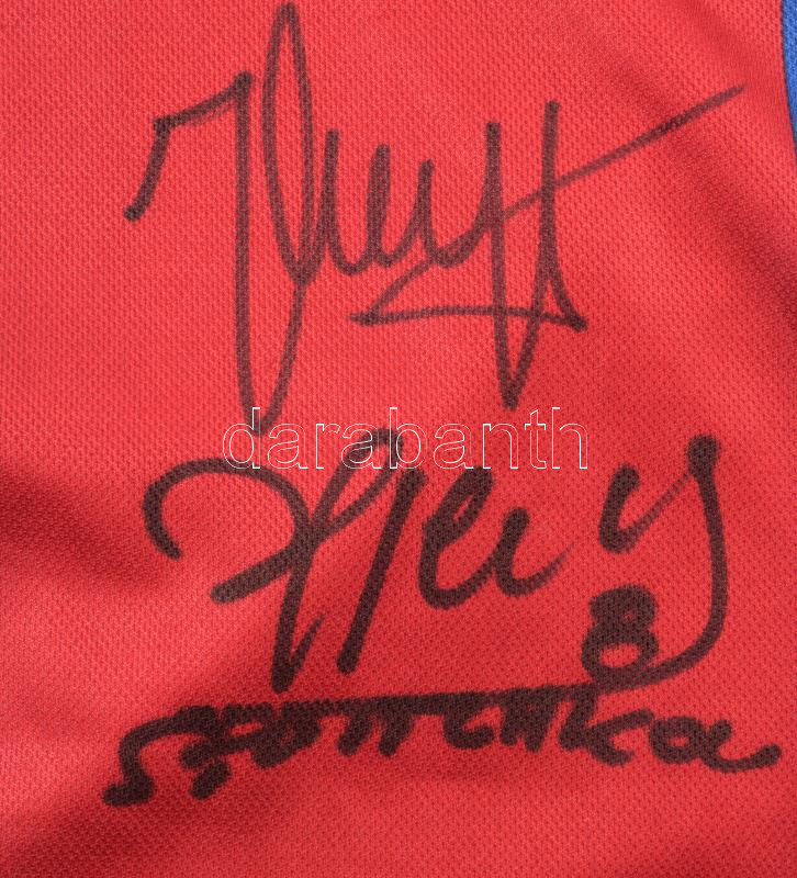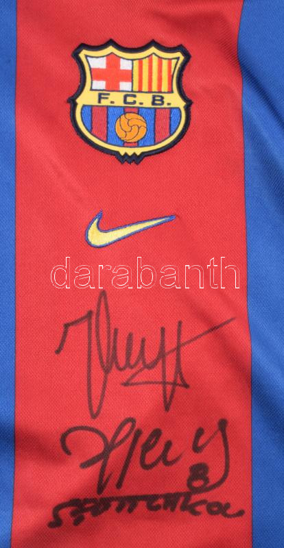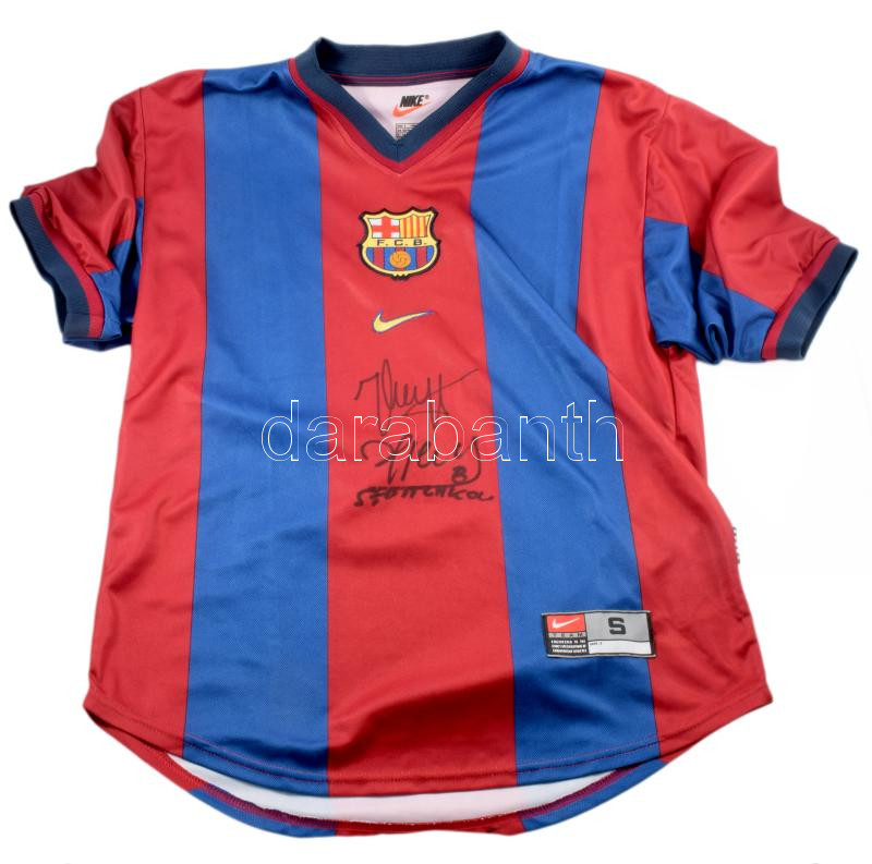 Az FC Barcelona labdarúgócsapat két játékosának aláírása a csapat mezén: Johan Cruijff (Cruyff) (1947-2016) holland labdarúgó, háromszoros aranylabdás (1971, 1973, 1974), illetve Hriszto Sztoicskov (1966- ) bolgár csatár, aranylabdás (1994) // FC Barcelona football jersey signed by two players: Johan Cruyff (1947-2016) Dutch footballer, three-time Ballon d'Or winner (1971, 1973, 1974), and Hristo Stoichkov (1966- ) Bulgarian footballer, Ballon d'Or winner (1994)