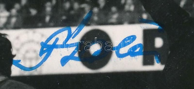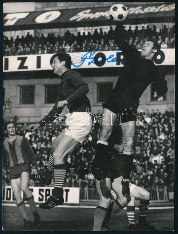 Fatér Károly (1940-2020) labdarúgó, kapus, a Csepel SC játékosa, olimpiai bajnok (Mexikó, 1968) autográf aláírása őt ábrázoló fotón (Csepel SC - FTC mérkőzés, a képen Albert Flórián mellett látható), 12x9 cm