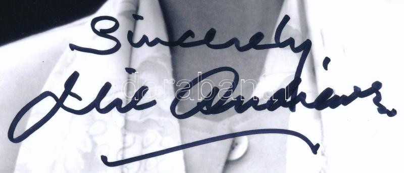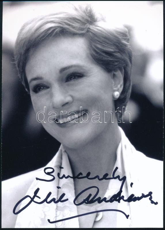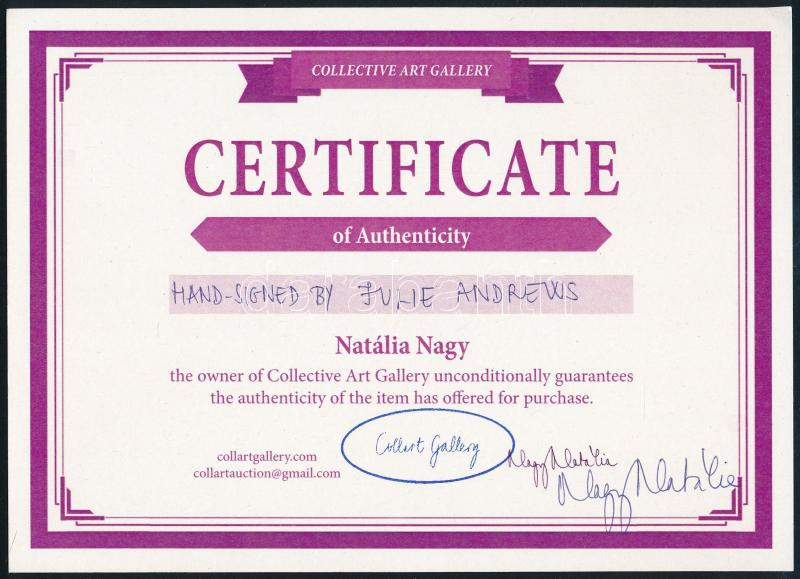Julie Andrews (1935-) Oscar-, háromszoros Golden Globe-, háromszoros Primetime Emmy-, valamint BAFTA-díjas angol színésznő aláírása az őt ábrázoló képen