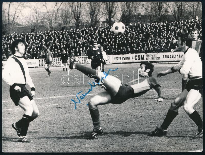 Beschreibung: Németh Miklós (1946- ) labdarúgó, csatár, a Csepel FC (korábban az FTC) játékosának autográf aláírása őt ábrázoló fotón, 9x12 cm
