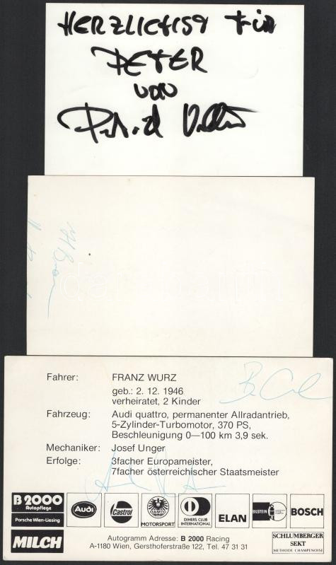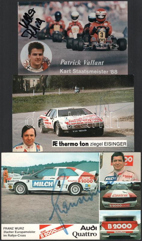 Beschreibung: Osztrák autóversenyzők által aláírt képek: Patrick Vallant, Franz Wurz, stb., 3 db
