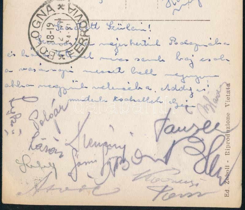 cca 1934 Bologna, Toldi (Tunigold) Géza (1909-1985) válogatott labdarúgó, az FTC játékosa által saját kezűleg megírt és édesapjának, Tunigold Józsefnek hazaküldött képeslap, a Ferencváros több játékosának aláírásaival, köztük Polgár Gyula, Sárosi György, Lázár Gyula, Kemény Tibor és mások