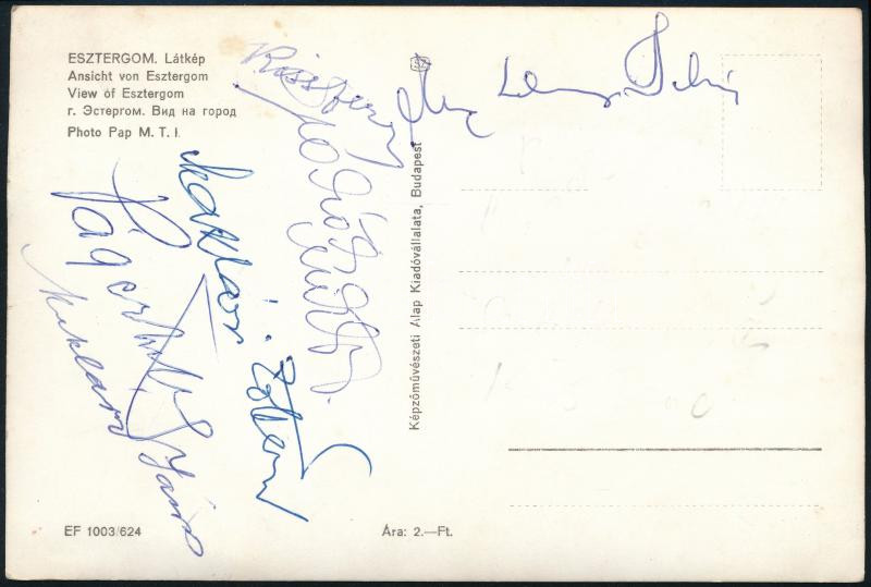 Beschreibung: cca 1962 Magyar színészek aláírásai esztergomi képeslapon: Páger Antal, Kiss Ferenc, Szakáts Miklós, Makláry Zoltán, Makláry János