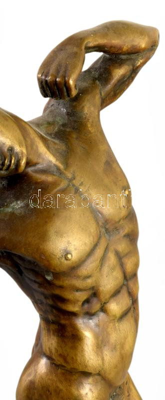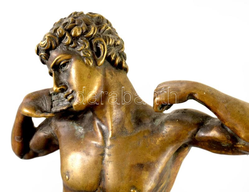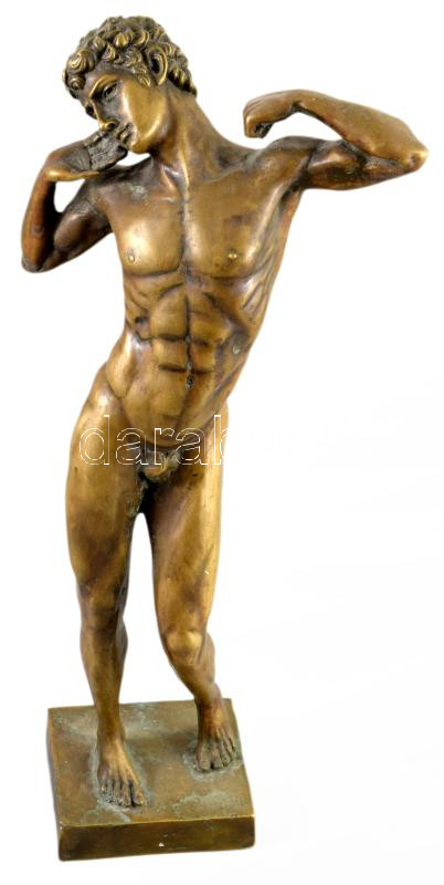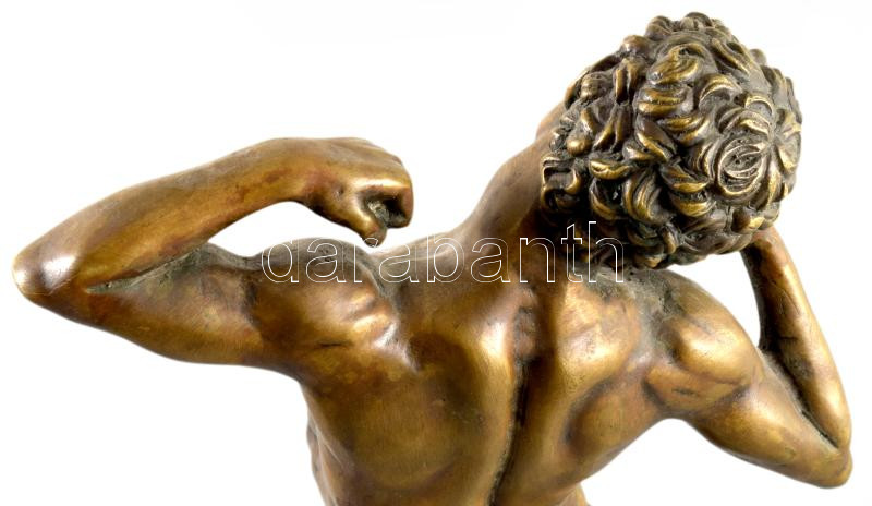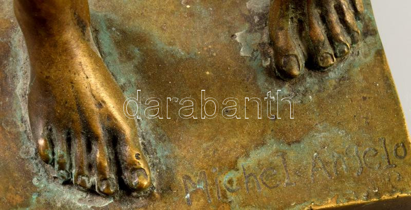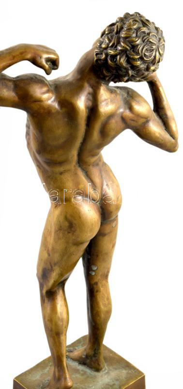 Frederic Leighton (1830-1896) után: The Sluggard. A levéllel takart változat. A művész alkotását későbbi utánöntéseknél, reagálva az alkotást ért kritikákra, miszerint Michelangelora hasonlít, illetve túl erotikus, falevéllel eltakarva öntötték, talapzatán pedig a "Michel Angelo" felirat szerepel. Bronz, m: 40 cm /// After Frederic Leighton (1830?1896): The Sluggard. The version with the leaf covering. In later castings of the artist's work's responding to criticism that it resembled Michelangelo and was overly erotic - it was produced with a fig leaf covering, and the base bears the inscription "Michel Angelo". Bronze, h: 40 cm.