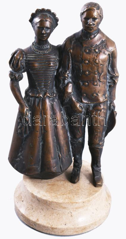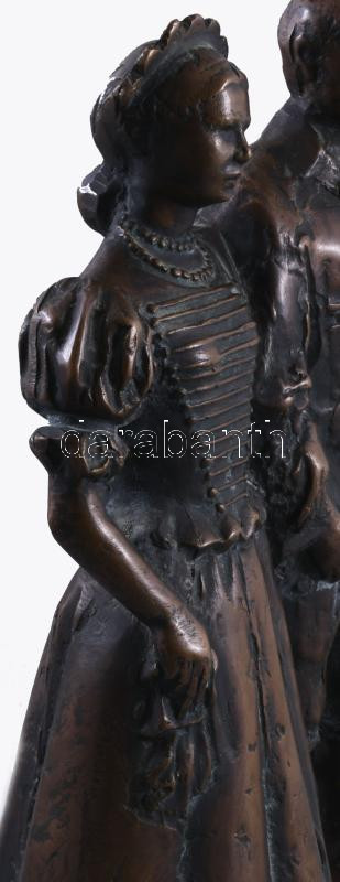 Józsa Lajos (1944-): Bika Bálint és felesége. Bronz, talapzaton, jelzett, m: 34,5 cm /// Lajos Józsa (1944-): Bálint Bika and his wife. Bronze, on a base, signed, height: 34.5 cm. /// A művész Debrecenben is megtalálható alkotásán az Aranybika Szálloda alapítóját és feleségét formázta meg.