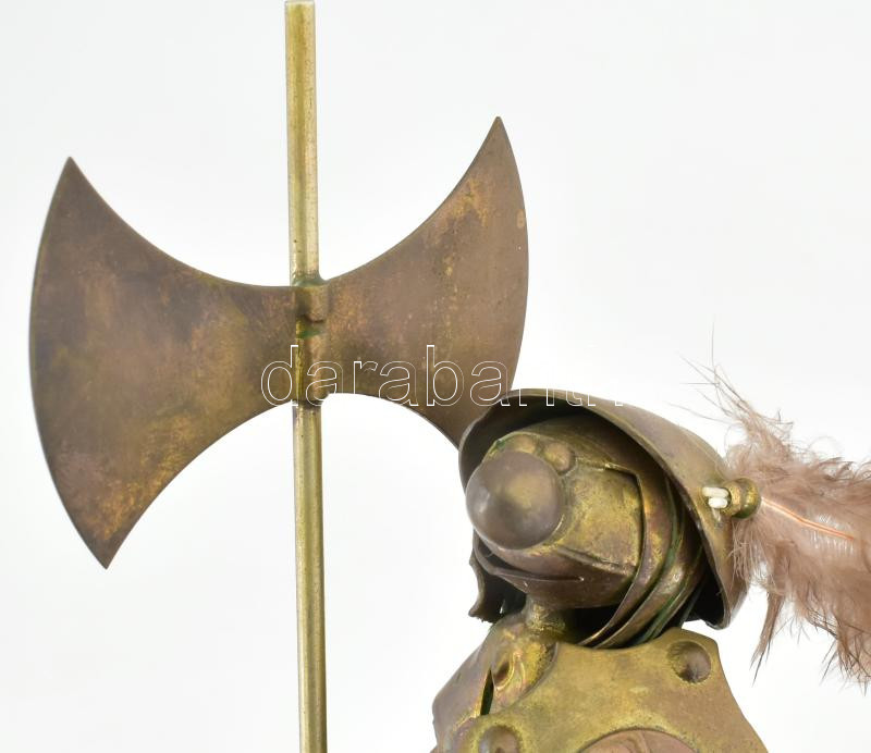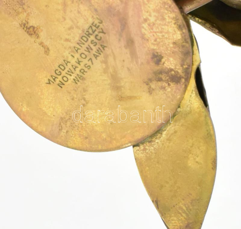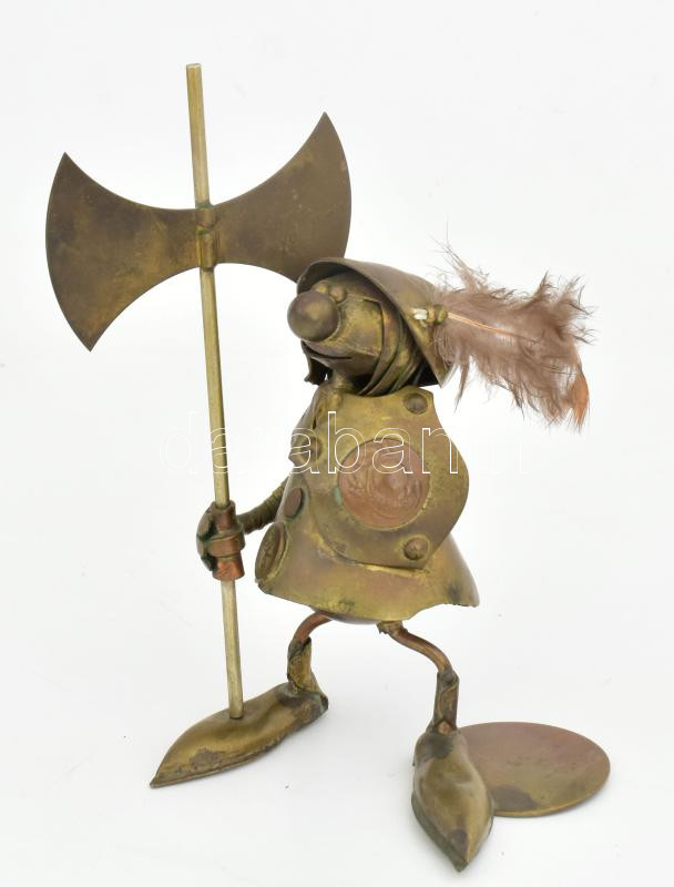 Mid-Century Figurative Art by Magda és Andrzej Nowakowscy (1938 - 2008): Alabárdos. Szobor, örvösművészeti réz. Jelzett: Magda i Andreze Nowakowscy. m: 14,5 cm /// Andrzej Jerzy Nowakowski Warszawa / Varsó. 1938. október 2-án született Lublinban. Miután Varsóba költözött, ahol befejezte az általános iskolát. Még annak befejezése előtt sikeres felvételi vizsgát tett a varsói Állami Képzőművészeti Középiskolába, ahol négy évig (1953-1957) tanult, és nagyon jó jegyeket kapott művészeti tárgyakból - rajz, festészet, szobrászat -. Az 1957-1966-os években kizárólag a művészeti munkának szentelte magát - akvarelleket és olajfestményeket festett, valamint vázlatokat és karikatúrákat rajzolt. Ebben az időszakban "fedezte fel" a művészi fémművességet, amely szerelme és szenvedélye lett, amely egész életében kitartott. Először fémből készítette első munkáit: ékszereket (karkötőket, gyűrűket, brossokat és nyakláncokat), és - ami egész életművének védjegyévé vált - egyedi figurákat.
