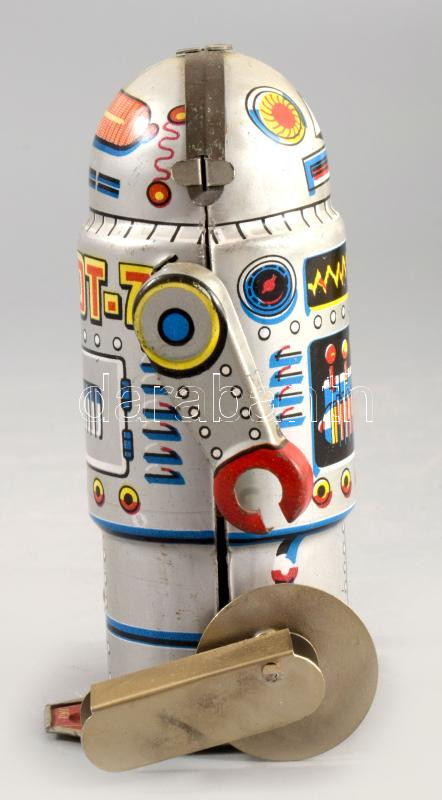 Noguchi Mechanical Walking Robot-7 lemezjáték. cca 1960/1970, Tajvan, fémlemez, felhúzós lemezjáték, eredeti dobozában, m: 9,5 cm /// Noguchi Mechanical Walking Robot-7 tin toy. ca. 1960/1970, Taiwan, tinplate, wind-up tin toy, in its original box, height: 9.5 cm