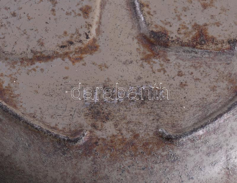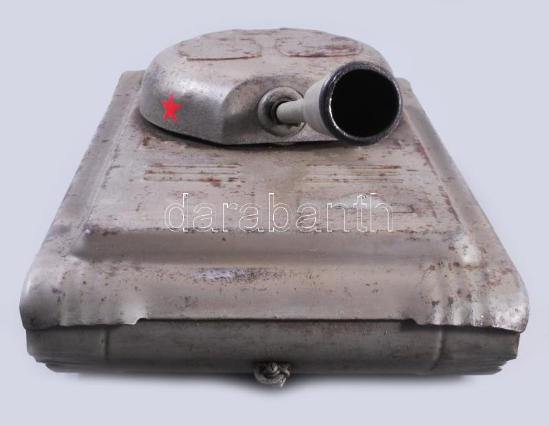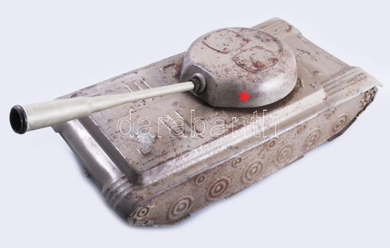 Szovjet lemez játéktank. Zaporizhstal Vasgyár, cca 1950/60, jelzett, kopással, pótolt ágyúcsővel, 52x23 cm /// Soviet tin toy tank. Zaporizhstal Ironworks, circa 1950/60, marked, with wear, replaced gun barrel, 52x23 cm