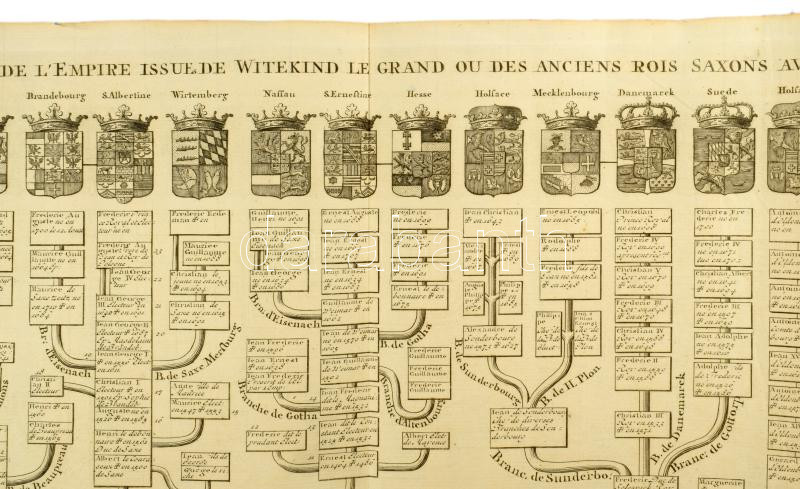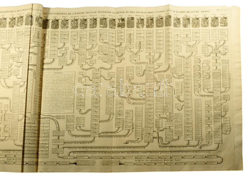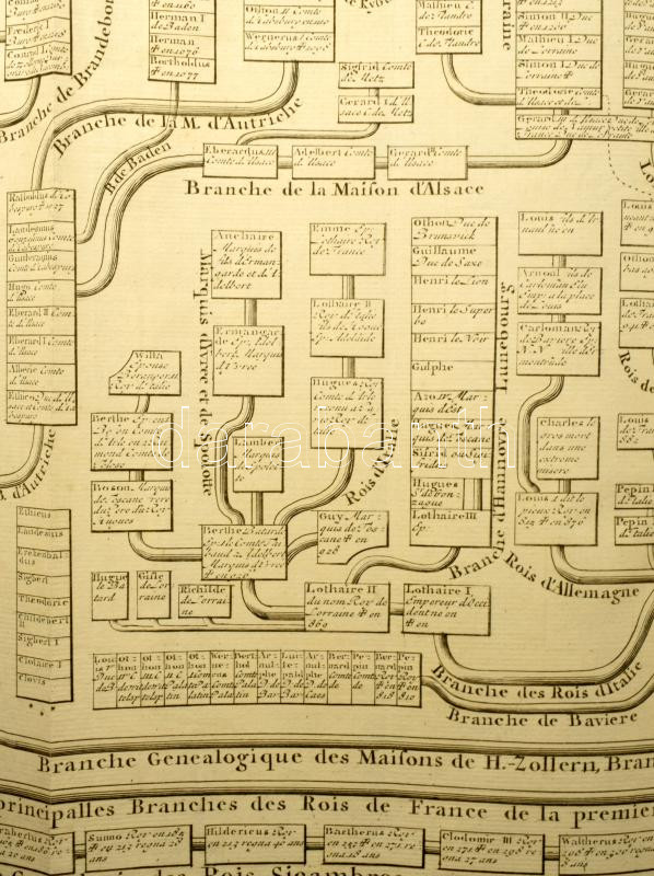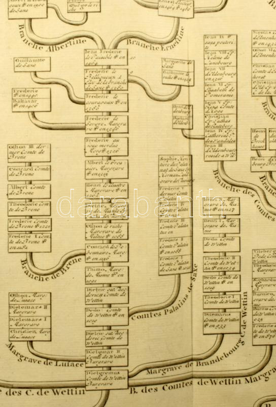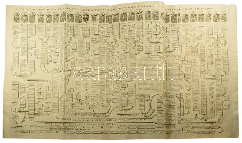 A Francia uralkodóházak hatalmas méretű családfája a családok címerével. 111 cm x 45 cm(!) Megjelent Amszterdamban 1720-ban. Henri Abraham Chatelain (1684-1743) párizsi származású hugenotta lelkész. Chatelain sikeres üzletember, jövedelmező nyomdahálózatot épített ki Londonban, Hágában, majd Amszterdamban is. Legismertebb műve az 1705 és 1720 között hét kötetben megjelent Atlas Historique. A monumentális mű a kontinensek történetét és genealógiáját dolgozta fel, olyan témákat tárgyalva, mint a földrajz, a topográfia, a heraldika és az etnográfia. A térképeket Henri készítette, nagyrészt Guillaume Delisle munkássága alapján, és betekintést nyújtottak a nagyközönségnek a tizennyolcadik század kibontakozó világába.