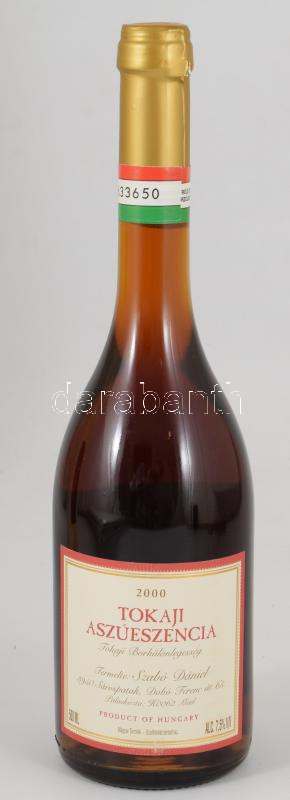 2000 Szabó Dániel Pincészete Tokaji Aszúeszencia, bontatlan palack fehér desszertbor, 7,5%, 0,5l /// 2000 Szabó Dániel Winery Tokaji Aszú Eszencia, unopened bottle of white dessert wine, 7.5%, 0.5L.
