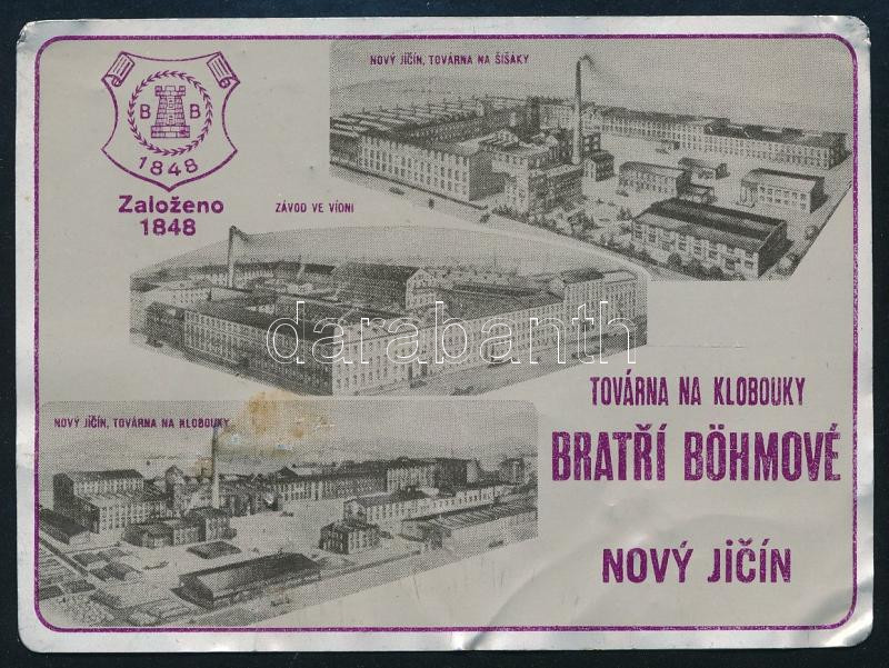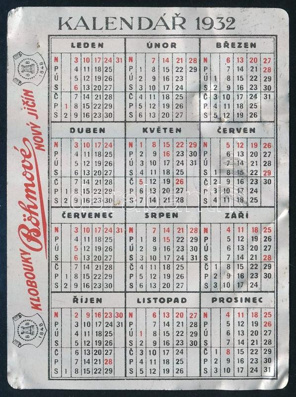 1932 Klobouky Böhmové Nový Jičín, cseh kalapgyárat reklámozó fém kártyanaptár, kisebb hibákkal, 7x9,5 cm // 1932 Klobouky Böhmové Nový Jičín, Czech hat factory advertisement metal calendar card, with minor faults, 7x9.5 cm
