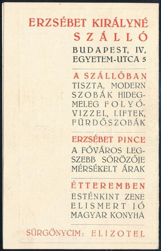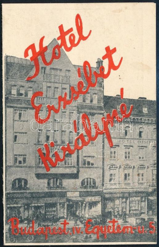 1933 Erzsébet királyné szálló (Bp., IV., Egyetem utca 5) reklámos zseb... https://www.darabanth.com/de/45-Gross-Auktion/45.1/Kunst-Dokumente-andere-Sammelgebiete/Werbungen~18995/1933-Erzsebet-kiralyne-szallo-Bp-IV-Egyetem-utca-5-reklamos-zsebnaptar-kinyitva-15x12~II3436707