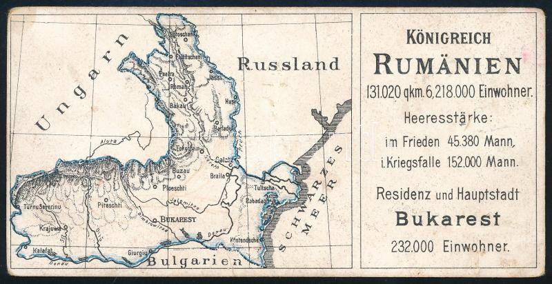 cca 1890 A Román Királyság, kétoldalas litográfia, I. Károly király, a címer és falusi jelenet képével, hátoldalon az ország térképével és néhány adattal, német nyelven, Chocolate Cacao reklámkártya, jó állapotban