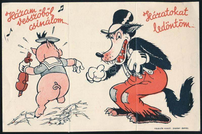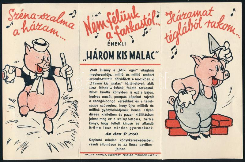 cca 1935 Walt Disney: A három kismalac c. rajzfilm könyvváltozatának magyar kiadását reklámozó színes prospektus. Bp., Pallas-ny., jó állapotban, kihajtva: 13x20 cm