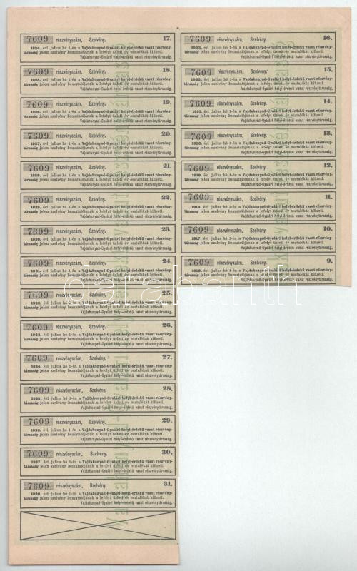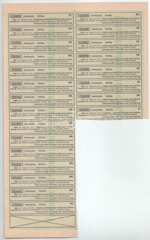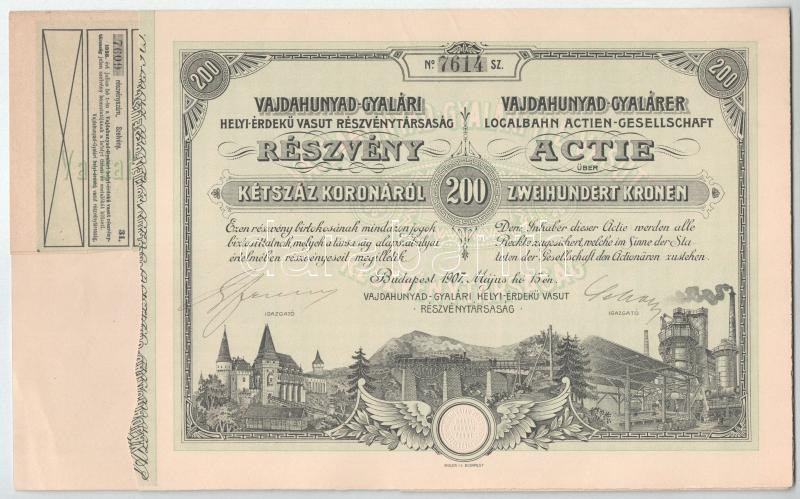 Hungary / Budapest 1907. "Vajdahunyad-Gyalári Helyi - Érdekű Vasút Részvénytársaság (Vajdahunyad-Gyalár Local - Interest Railway Share Company)" share about 200 Kronen with embossed stamp and coupons C:AU