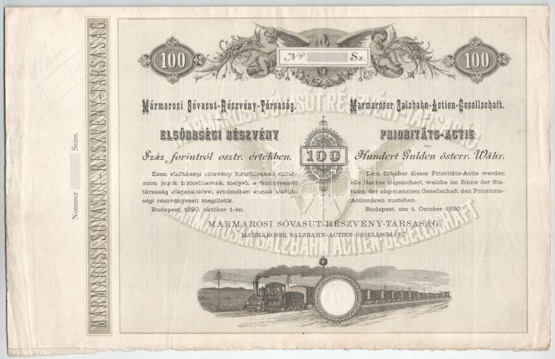 Budapest 1890. "Máramarosi Sóvasut-Részvény-Társaság" elsőbbségi részvénye 100Ft-ról, sorszám nélkül, szárazpecséttel T:F