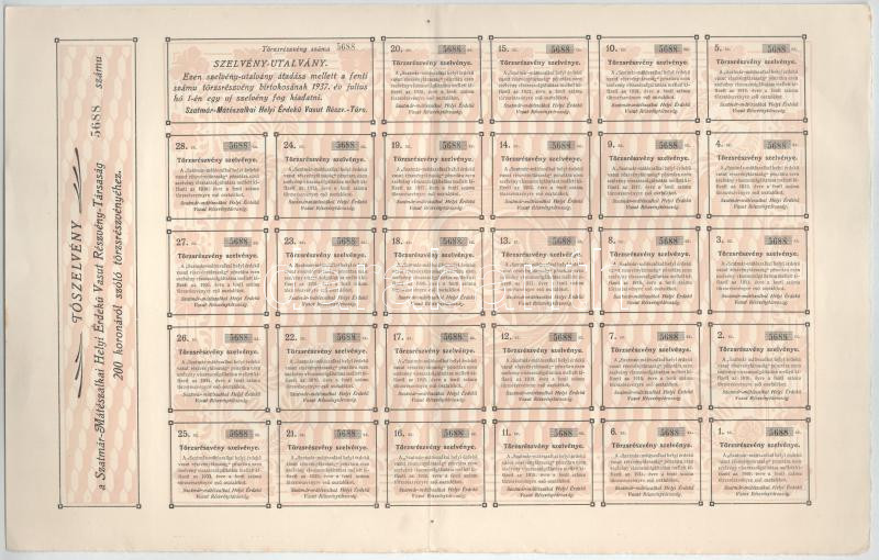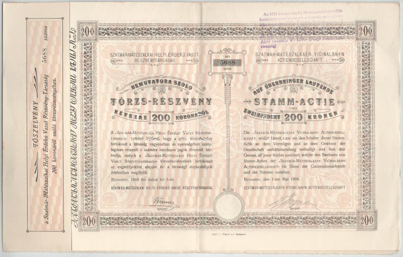 Budapest 1908. "Szatmár-Mátészalkai Helyi Érdekű Vasút Részvénytársaság" törzsrészvénye 200K-ról, szelvényekkel, bélyegzéssel T:XF