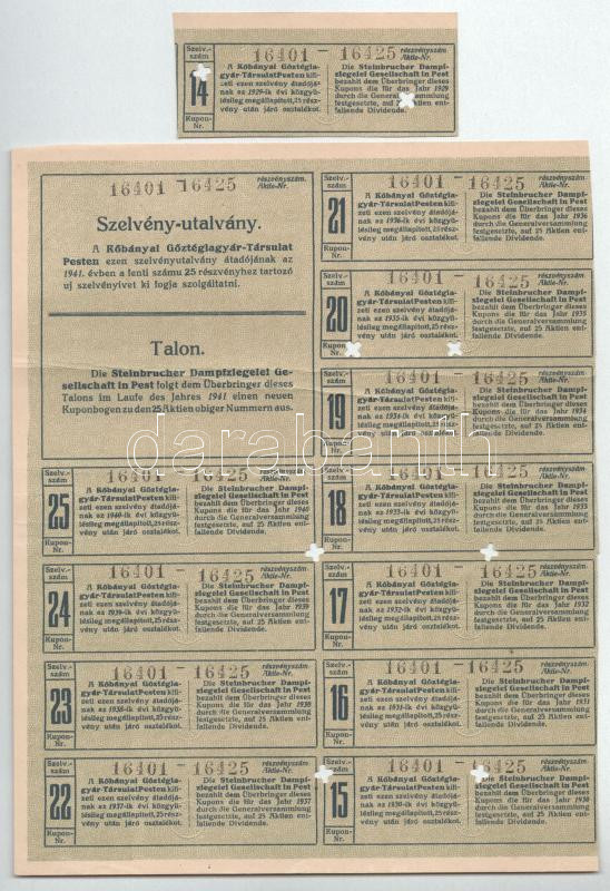 Hungary / Budapest 1916. "Brick Facktory of Kőbánya in Pest" twenty-five shares in one about 200 Kronen with stamps, coupons, cancelled by holes C:F