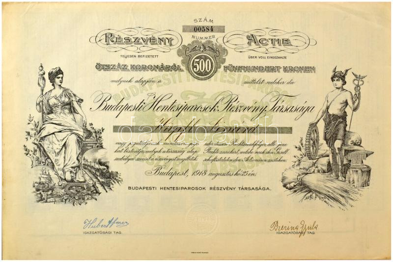 Budapest 1918. "Budapesti Hentesiparosok Részvény Társasága" névre szóló részvénye 500K-ról teljes szelvényívvel T:XF / Hungary 1918. Budapest "Budapest Butchers' Share Company" shares from 500 Korona with full coupon sheet C:XF