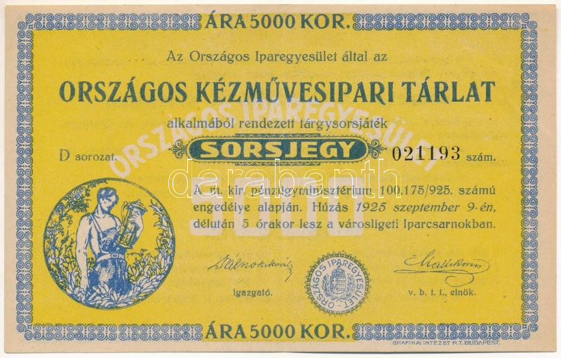 Budapest 1925. "Országos Kézművesipari Tárlat" sorsjegy 5000K értékben, "D 021193" sorszámmal T:XF /