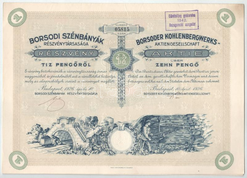 Budapest 1926. "Borsodi Szénbányák Részvénytársaság" részvén... https://www.darabanth.com/de/45-Gross-Auktion/45.1/Numismatik/Aktien-Wertpapieren-und-Tickets~18987/Budapest-1926-3Cem3EBorsodi-Szenbanyak-Reszvenytarsasag3Cem3E-reszvenye-10P-rol-szelveny~II3436780