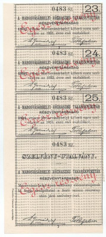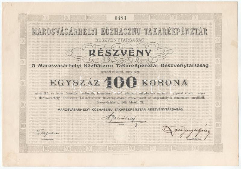 Marosvásárhely 1909. "Marosvásárhelyi Közhasznú Takarékpénztár Részvénytársaság" részvénye 100K-ról, "0483", szárazpecséttel szelvényekkel T:AU