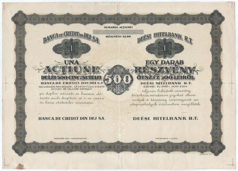 Románia / Dés DN "Deési Hitelbank R.T." részvény 500L-ről, sorszám nélkül MINTA, látható illesztőkerettel T:F tűly.