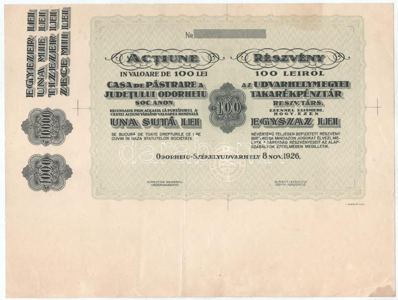 Romania / Odorheiu 1926. "Udvarhelymegyei Takarékpénztár Részvénytársaság" share about 100 Lei, SPECIMEN without serial numbers, with visible printig frames C:F