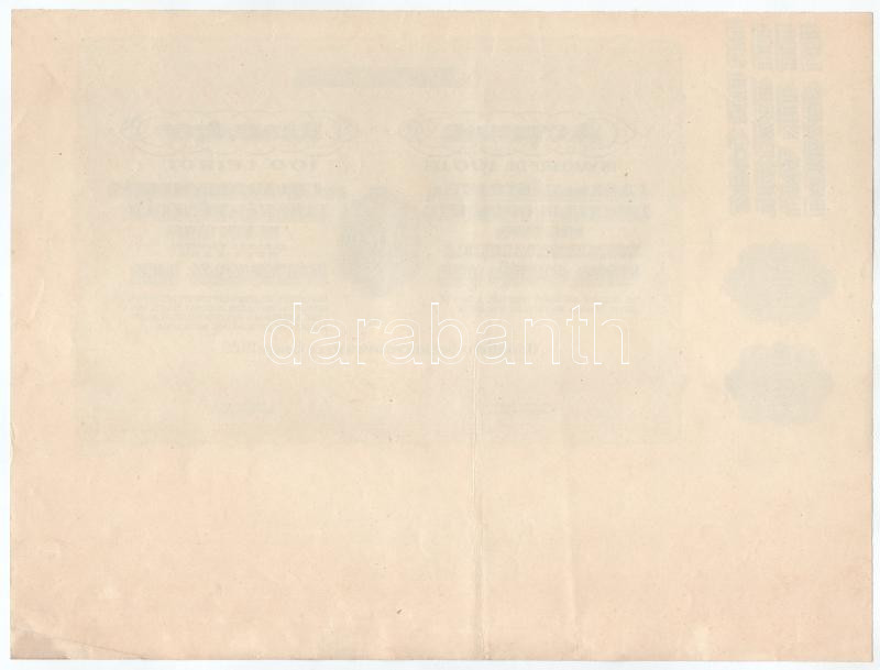Románia / Székelyudvarhely 1926. "Udvarhelymegyei Takarékpénztár Részvénytársaság" részvénye 100L-ről, sorszám nélküli MINTA látható illesztőkeretekkel T:F