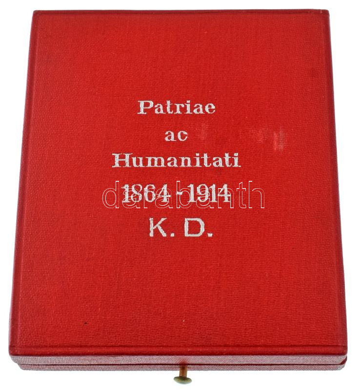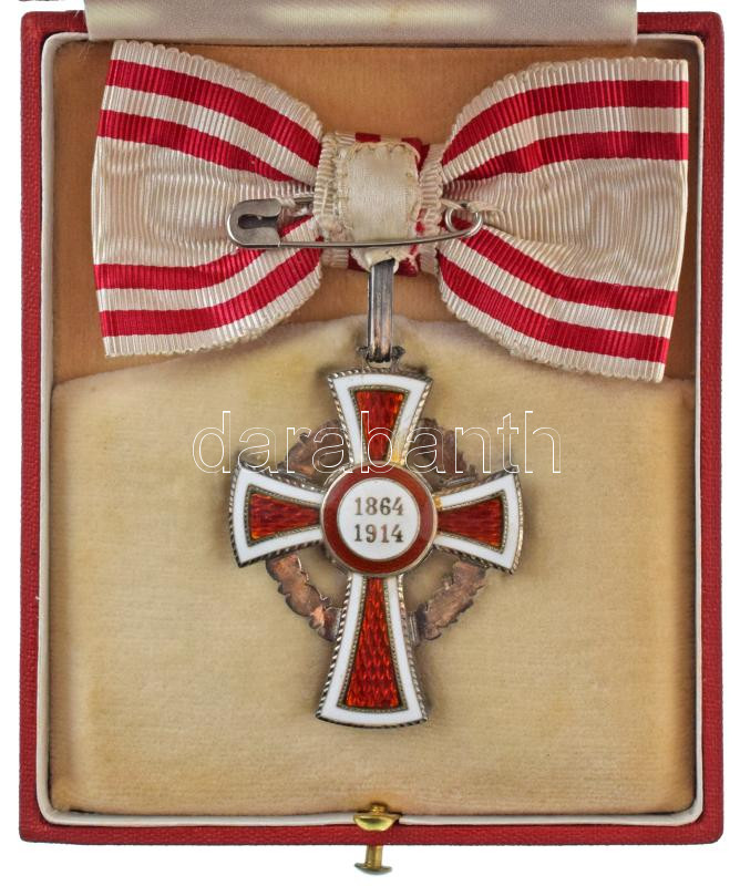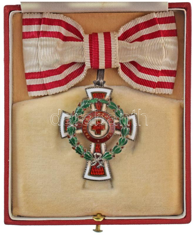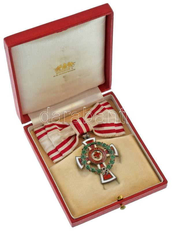 1914. "A Vörös Kereszt tiszti Díszjelvénye hadidíszítménnyel" zománcozott, jelzett Ag kitüntetés női csokorszalaggal, Minerva fejes jelzés a függesztőkarikán. Eredeti rendkívül szép állapotú "Patriae ac Humanitati 1864-1914 K.D." adományozói tokban. A tok belső oldalán "BACHBUCH A. CS. ÉS . KIR. UDVARI ÉKSZERÉSZ" gyártói jelzés. (48x38mm) T:AU / Hungary 1914. "Red Cross, Badge of Honour for Officers with a war decoration" enamelled, hallmarked Ag decoration with with women's bouquet ribbon, Minerva's Head hallmark on the ring. In original "Patriae ac Humanitati 1864-1914 K.D." award case. Inside the case "BACHBUCH A. CS. ÉS . KIR. UDVARI ÉKSZERÉSZ"" maker's mark (48x38mm) C:AU