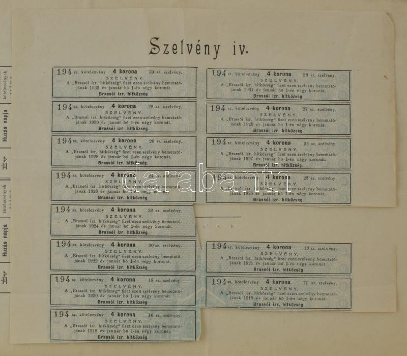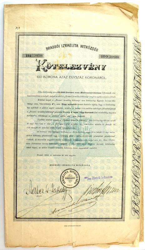 1902. Brassó "Brassói Izraelita Hitközség" kötelezvénye 100K... https://www.darabanth.com/de/45-Gross-Auktion/45.1/Numismatik/Notgeld-aus-Papier-und-Metall~18981/1902-Brasso-3Cem3EBrassoi-Izraelita-Hitkozseg3Cem3E-kotelezvenye-100K-rol-szelvenyekkel-be~II3437052